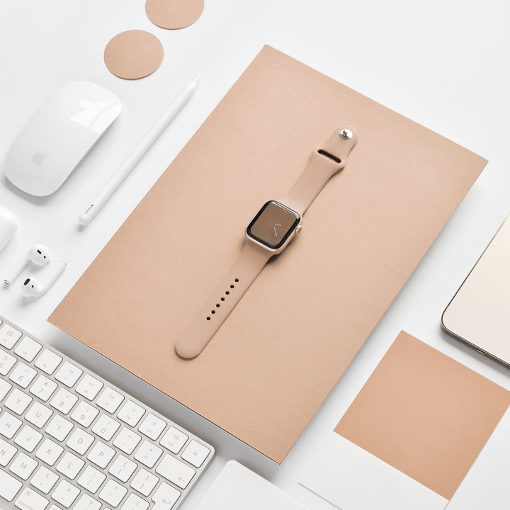A person is wearing the Coconut Lane NAKD Apple Watch Strap in Cappuccino on their wrist. The background features an Apple iPhone, a wireless mouse, a stylus, earphones, a keyboard, and a notebook, all in beige and white tones. This minimalist tech setup is enhanced by the stylish NAKD Collection silicone Apple Watch Bands from Coconut Lane.
