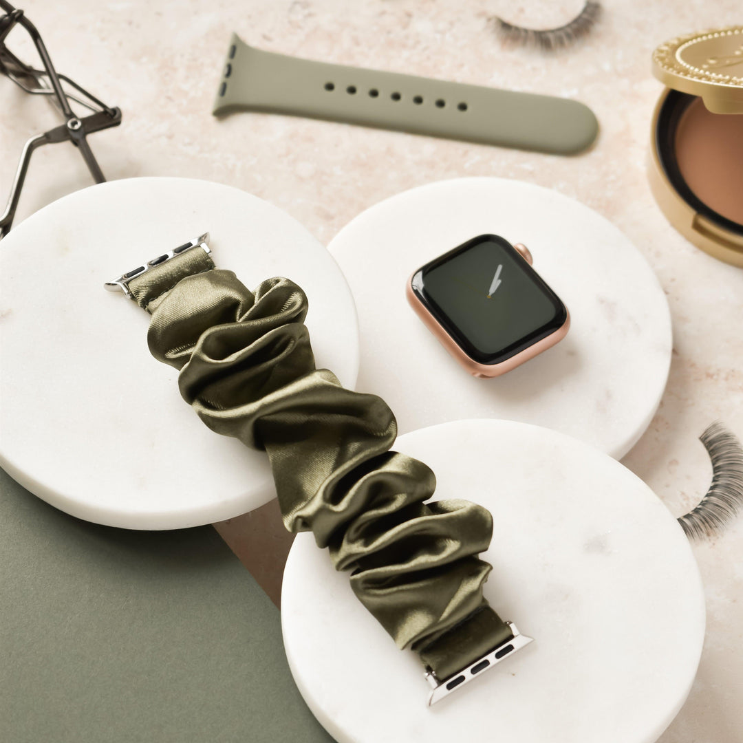 Say hello to our Vintage Khaki Apple Watch Strap in a unique Scrunchie wrist band design. This silky satin will bring timeless comfort and a sprinkle of understated glam to your every day.