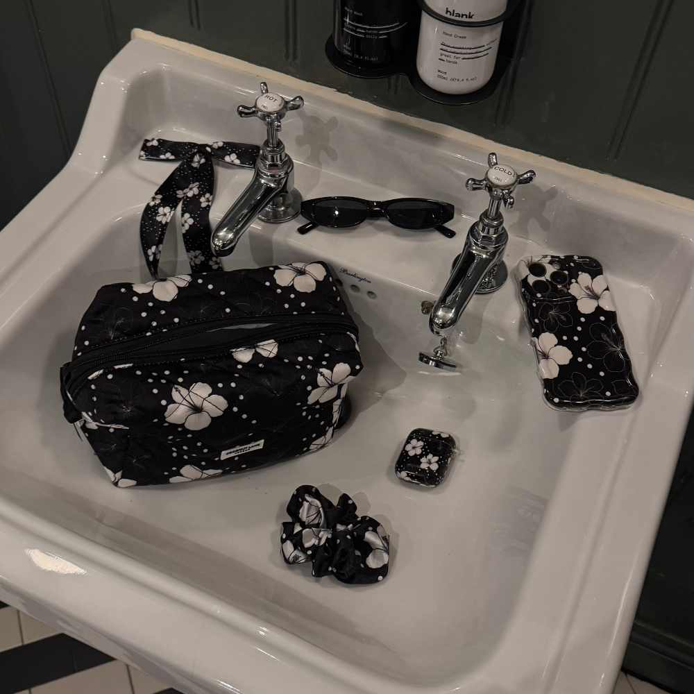 Our Satin Quilted Makeup Bag – Mono Flora is as pretty as it is practical, dressed in a dreamy monochrome floral print that feels oh-so-chic. The silky satin quilting gives it a touch of luxury, while the spacious interior is perfect for stashing all your must-haves – from lippies and liners to your favourite perfume mini.